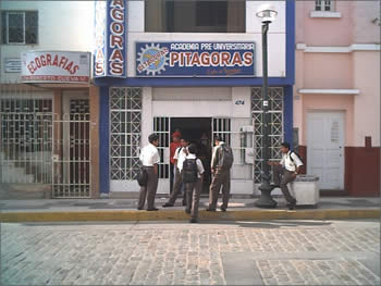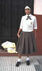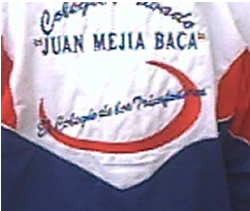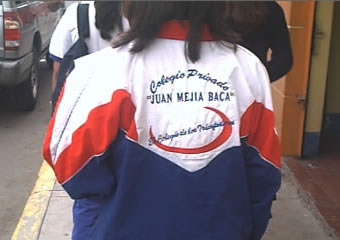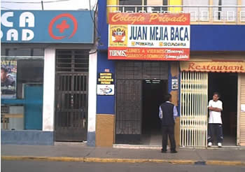 A highschool student in her mandatory excersise jacket on sports day. It reads Colegio Privado. Juan Mejia Baca. El Colegio de los Triumfadores. This means "Private High School Juan Mejia Baca. The high school of the triumphant." Next is a picture of the main entrance to this highschool where the "triumphant people" go. The man standing under the sign is the gaurd. He doesn't let anyone in who is not authorized. After all, they wouldn't want anyone coming in and looking around to steal their secrets of triumph. This impressive sounding learning institution is located between a pharmacy and a restaurant. It probably has about 10 classrooms. Notice how the sign is bigger than the door!