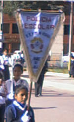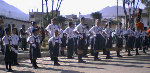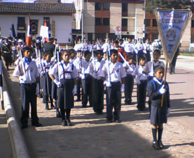 Below are more pictures of the ceremony, in which they line the student police up with the military soldiers. By the way, in my original file on the student police in Peru I wrote that when I looked at the students with the special cords on their uniforms, I thought they looked like student police, but here in Cajamarca was the firsr time I actually saw a flag saying "POLICIA ESCOLAR" All the students in the pic are holding sticks, just as the soliders hold rifles.