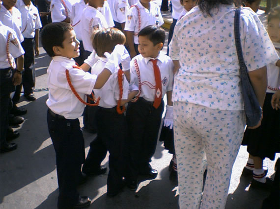 It looks like these kids are still unbrainwashed enough to remember how to have fun. But if they are hit enough and yelled at enough over the years, I am sure they will learn how important it is to stand still and look serious. By the way, I saw children about this age, also in uniforms, in Indonesia being brainwashed about the Muslim beliefs, and also in Thailand about the Buddhist beliefs, and in Singapore about either Muslim, Christian or Buddhist beliefs, depending on the school. Its not just the Catholics who brainwash their young.